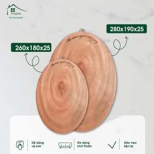 Thớt gỗ xà cừ hình elip THOGOSA, đạt chuẩn VSATTP, được làm từ gỗ tự nhiên với khả năng kháng khuẩn, chống mốc. Sản phẩm có thiết kế tinh tế, không chỉ dùng để cắt thái mà còn trang trí làm đẹp gian bếp, mang lại trải nghiệm nấu nướng tiện lợi và thẩm mỹ.